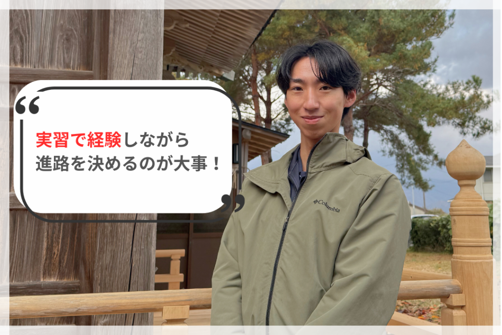もともと宮大工に興味がありましたが、2年生の覆屋を建てる実習で、図面を書くところから墨付け、加工作業、建物が建つ完成まで、一貫して現場に携われるのが施工管理の魅力だと感じたからです!