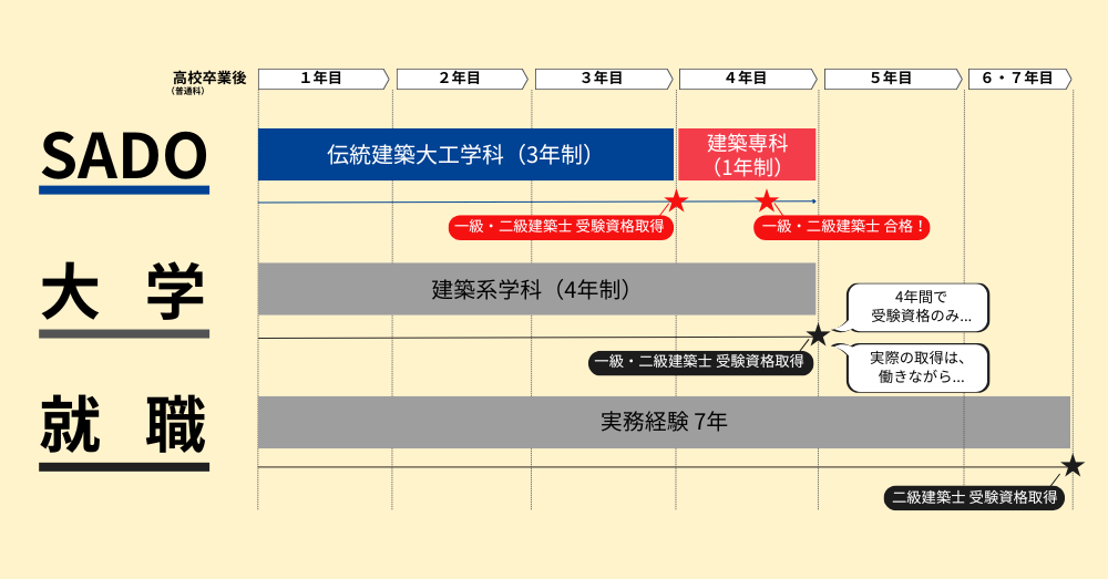 しかし、SADOでは伝統建築大工学科(3年制)から、「建築専科(1年制)」へ進学することで、大学と同じ4年間での『一・二級建築士取得』を可能にしています。